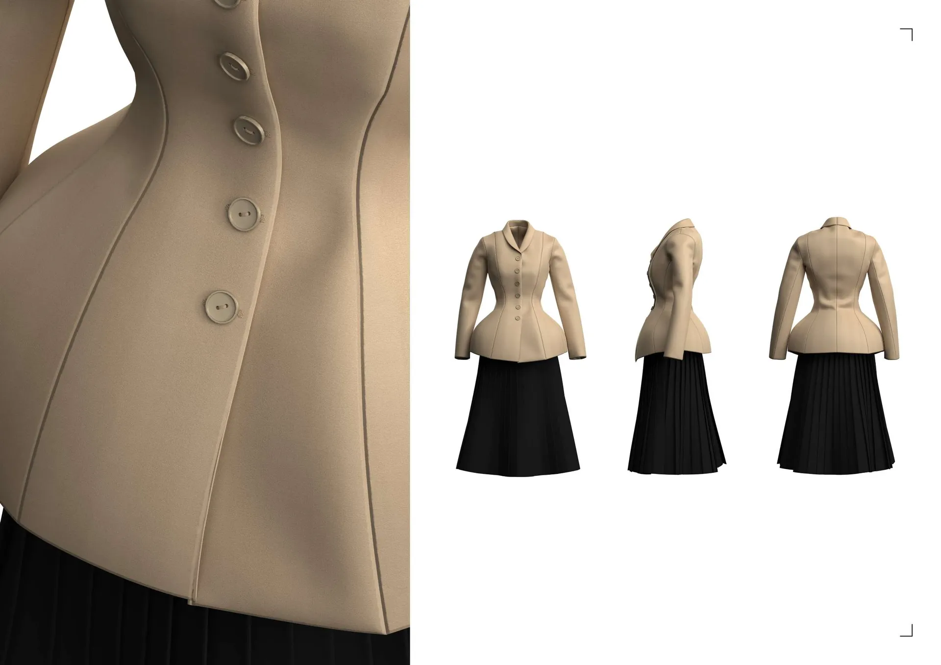 Exploración y reinterpretación de prendas icónicas mediante reconstrucción digital 3D y técnicas avanzadas, combinando modelado, renders e IA para generar propuestas contemporáneas y futuristas.